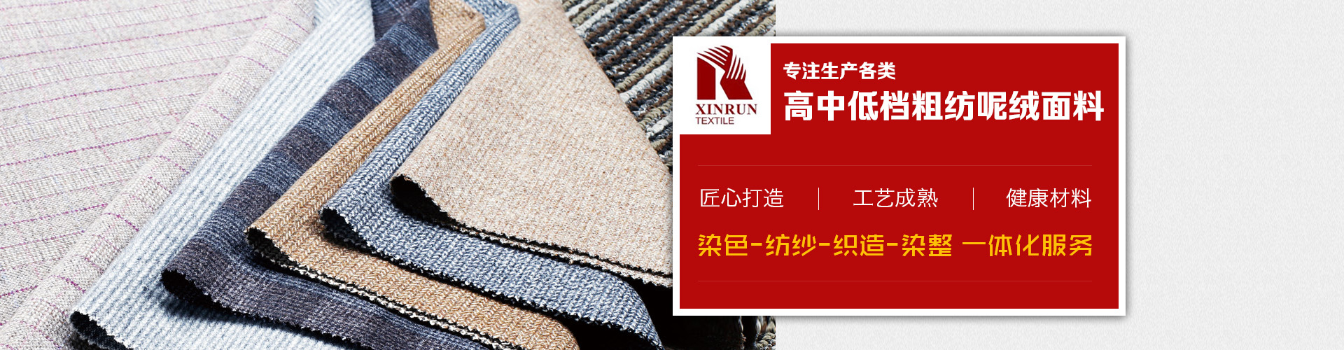 主要產(chǎn)品有:法蘭絨、麥爾登,立絨,順毛,兔羊絨,阿爾帕卡,雙面呢,格呢,斜紋呢、圈圈呢、針織毛呢,臺球呢和地毯等幾百個品種以及上千個花色,另外新開發(fā)特種花式紗面料、復合,印花,扎染,涂層,貼膜,防水,防靜電等各類功能型面料。